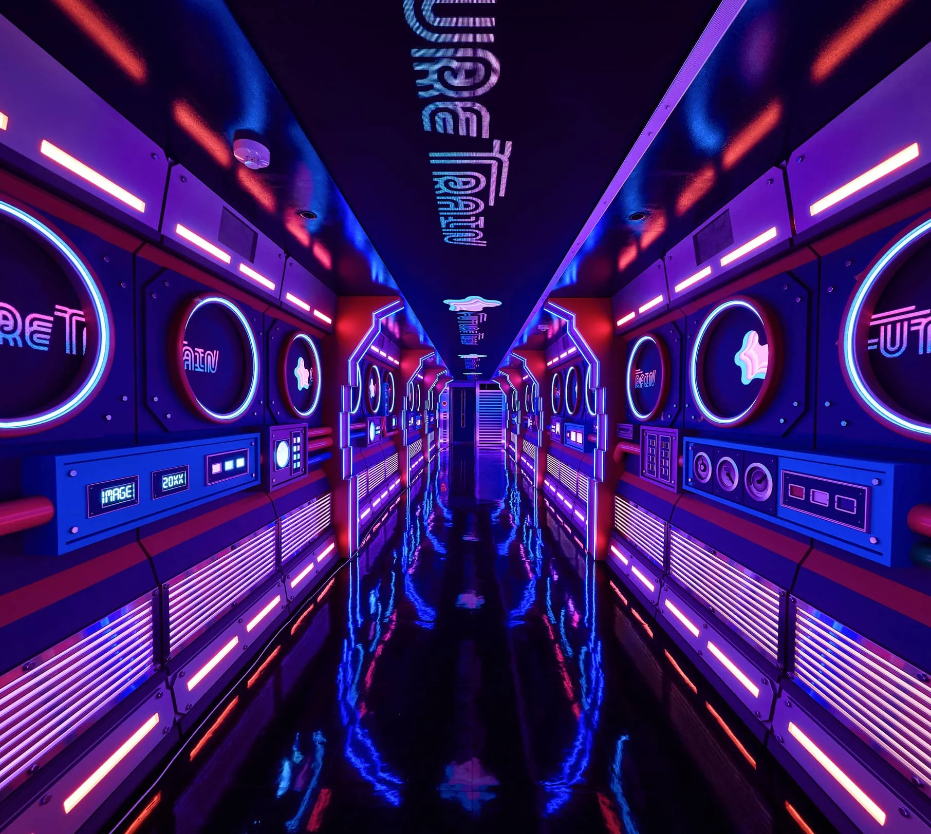 1号車は、かつて京都と北陸を結んでいた特急「サンダーバード」の先頭車両を再活⽤し「FUTURE BIRD」として蘇らせたアート体験空間。運転席や計器類の意匠を活かした造形と、映像、光、音が調和した不思議な空間に入場いただけます。
