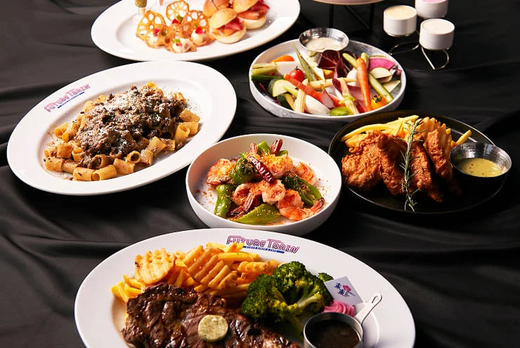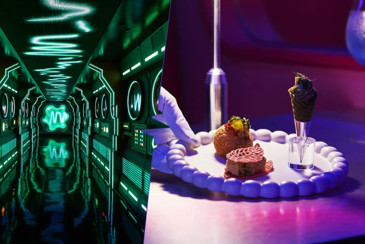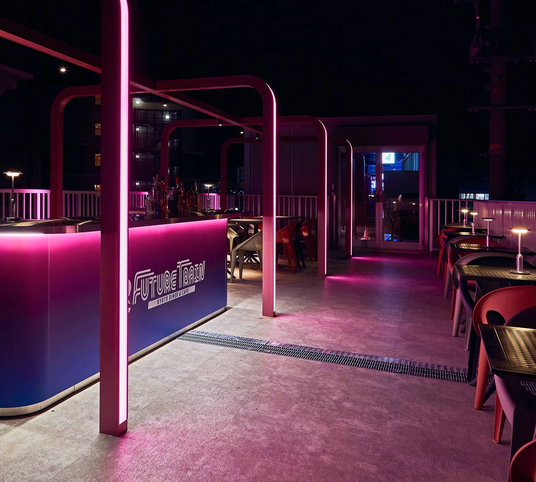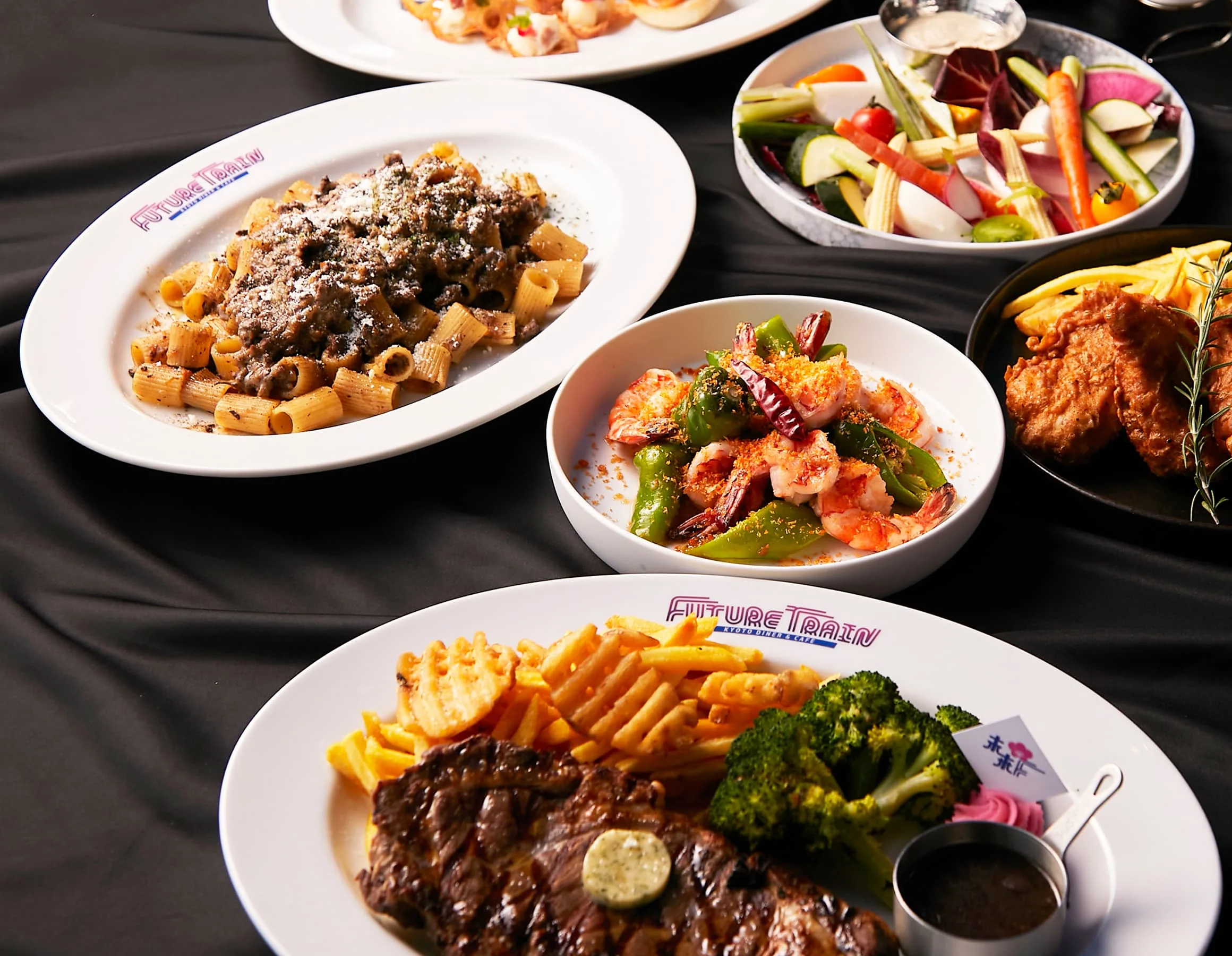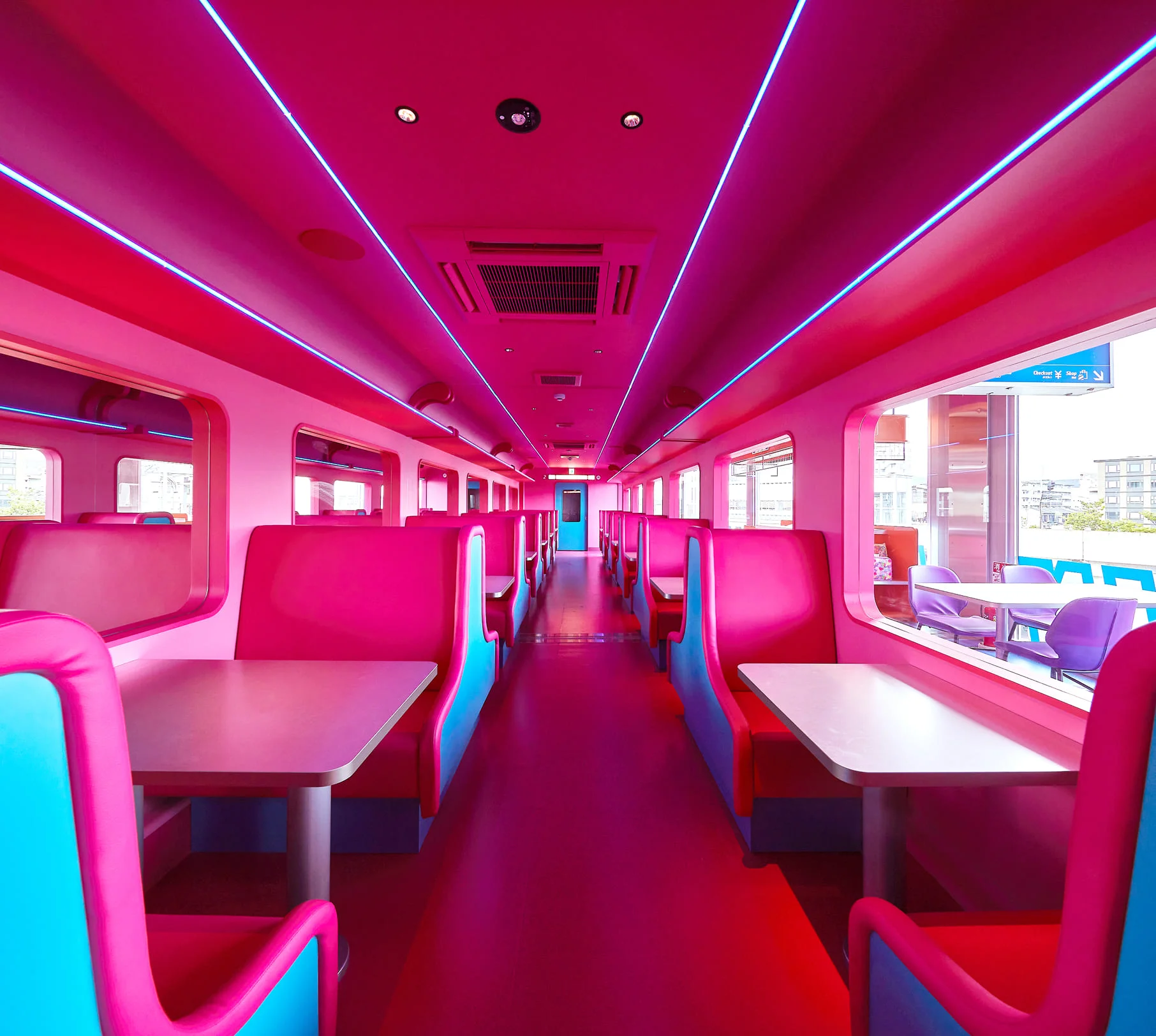 食堂車をモチーフにしたメインダイニング。 レトロフューチャーな車内で、オリジナル料理やドリンクを提供しています。