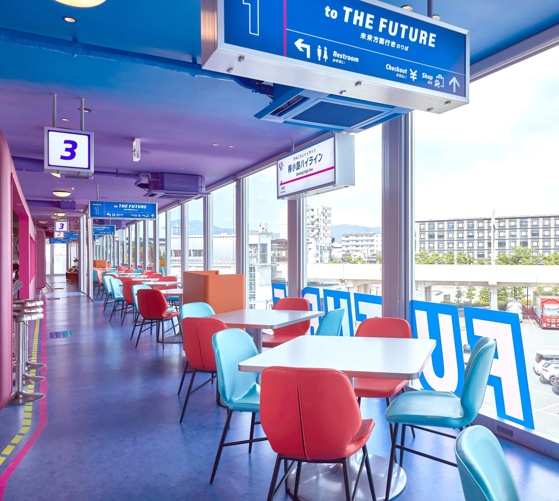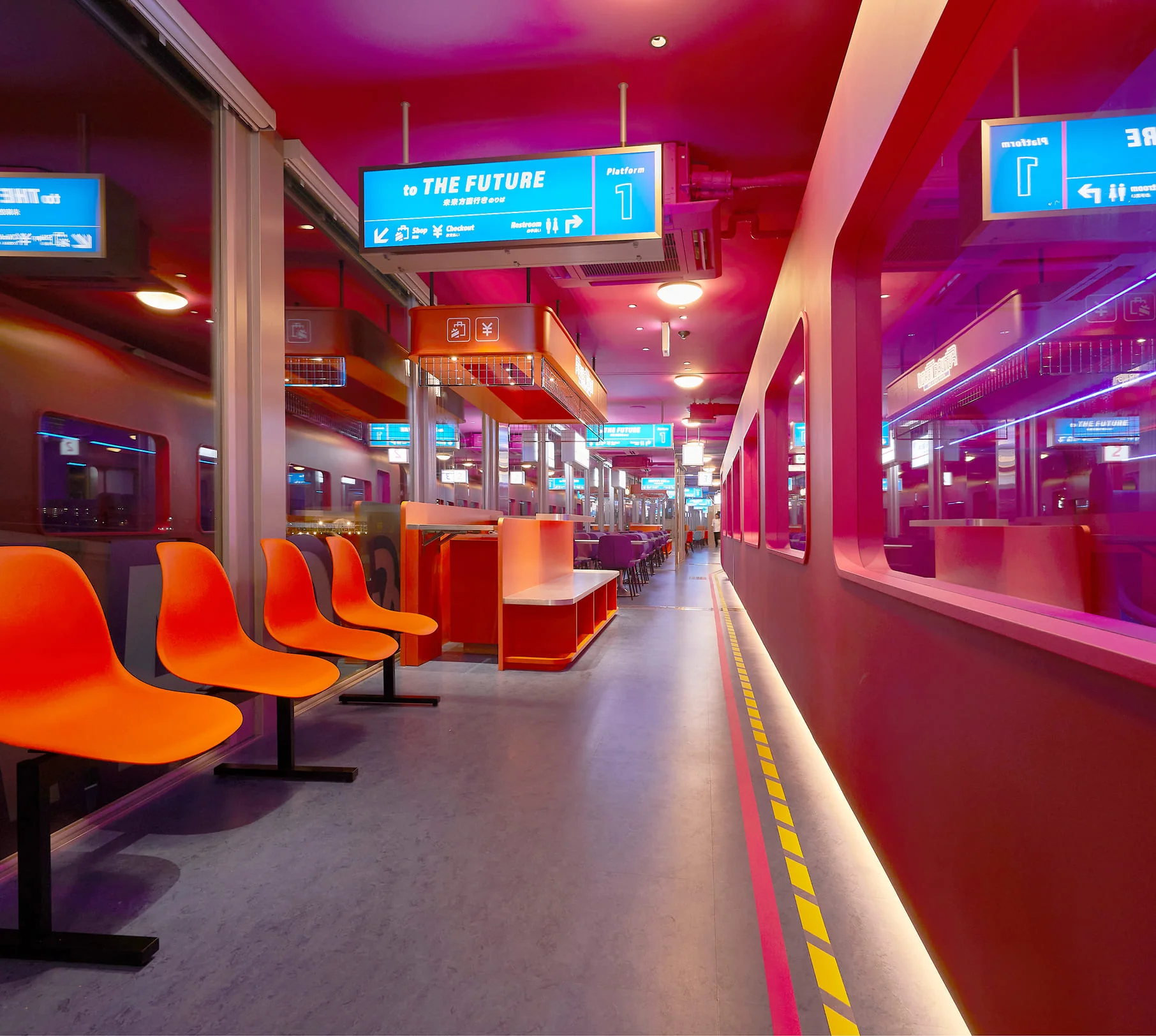 店舗入口となる“改札”を抜け、店内に入るとそこは未来行きの旅が始まる不思議なホーム。 列車に乗り込むように、訪れるゲストを想像力を刺激する空間と物語が待ち受けます。