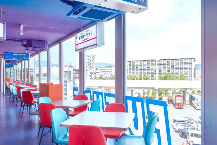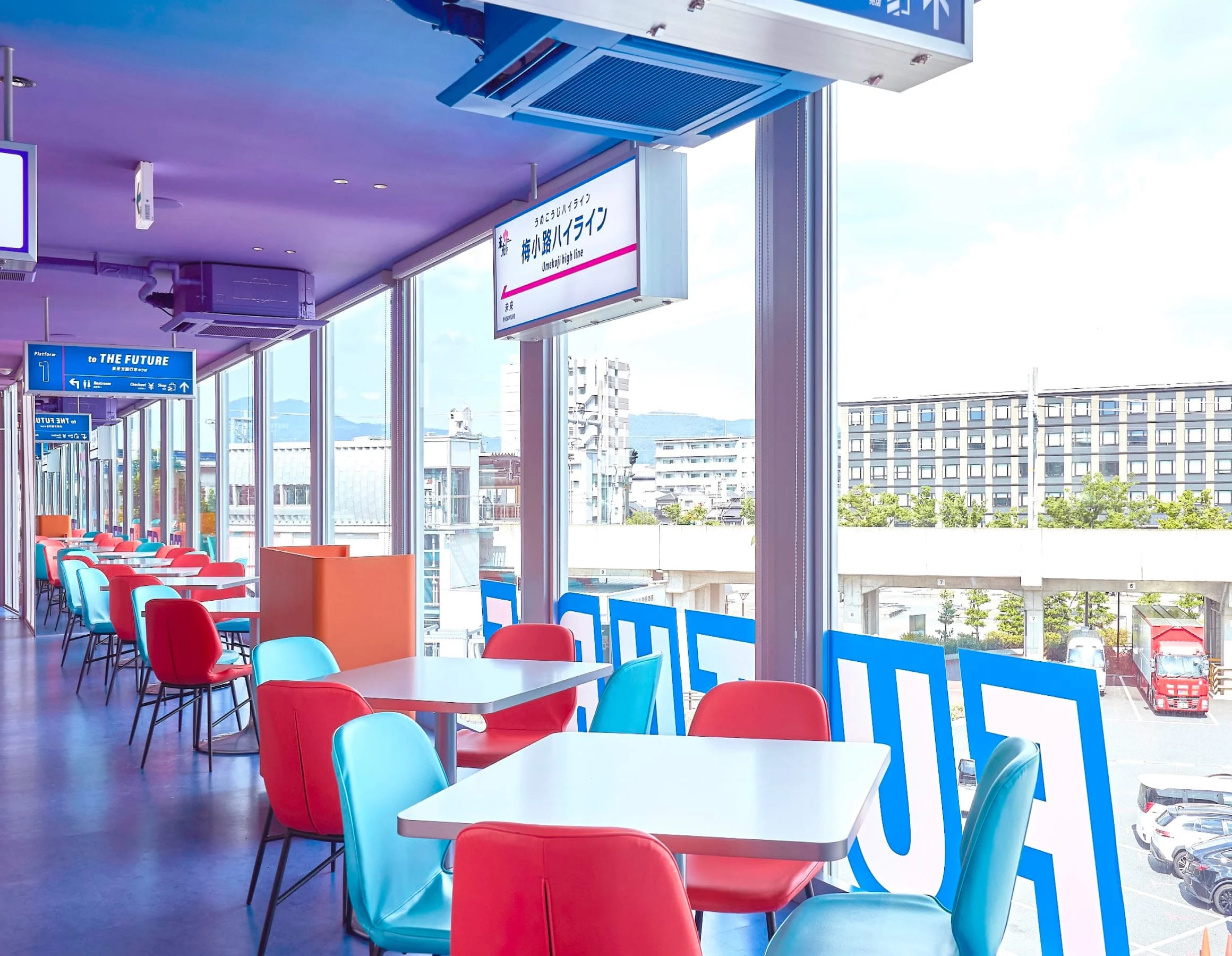 高架上に広がるテーブルスペース。 京都タワーや五重塔の景色を眺めながら、カジュアルに食事や会話を楽しめる空間をご用意。